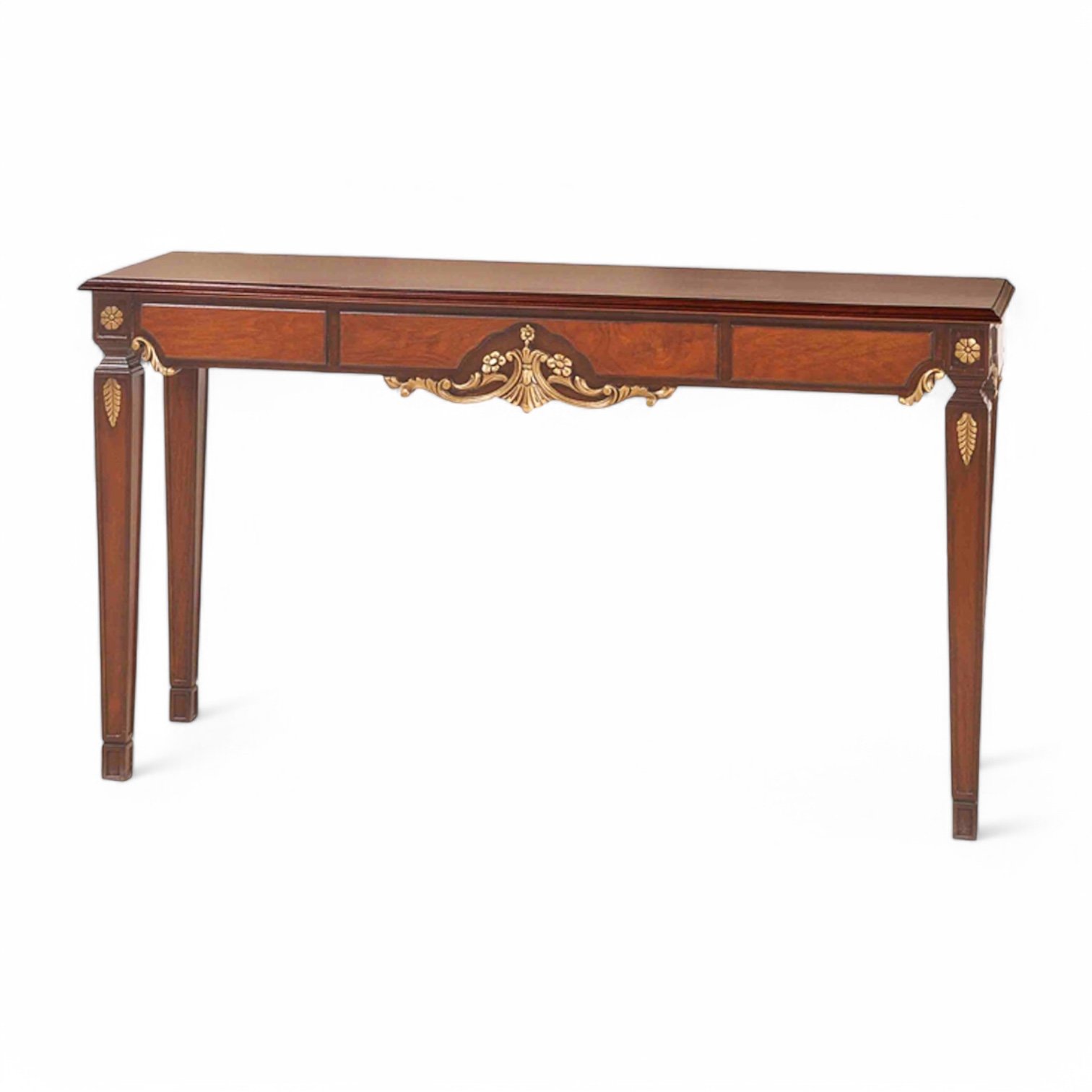Discover the enduring charm of our timeless classic console, crafted from solid wood with a sophisticated two-toned natural finish. The elegant carving details exemplify fine craftsmanship, while the subtle gold gilt accents add a touch of luxury. This versatile ensemble seamlessly blends classic design with contemporary elements, making it a captivating addition to any space. Elevate your home decor with this exquisite piece that effortlessly combines style and enduring appeal.