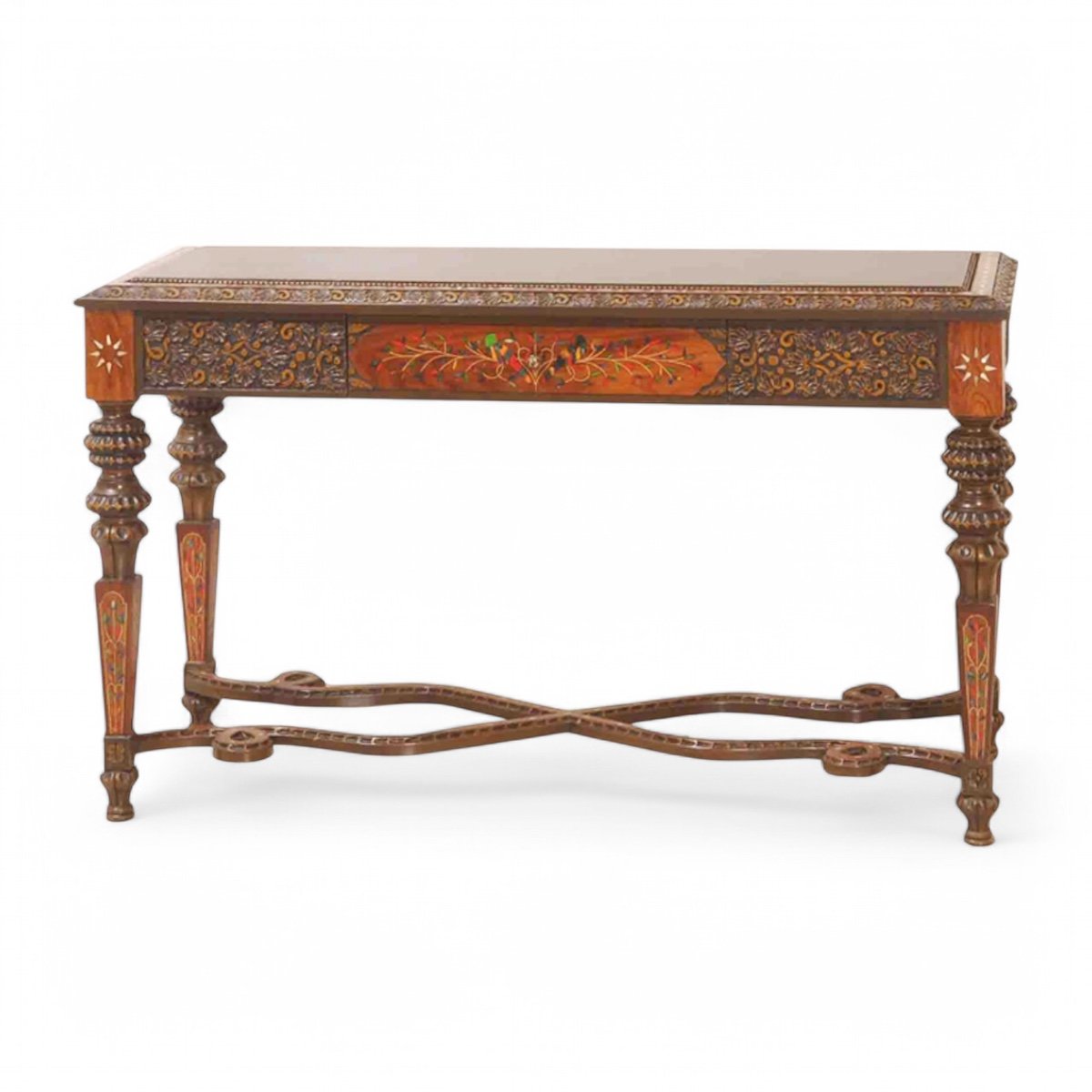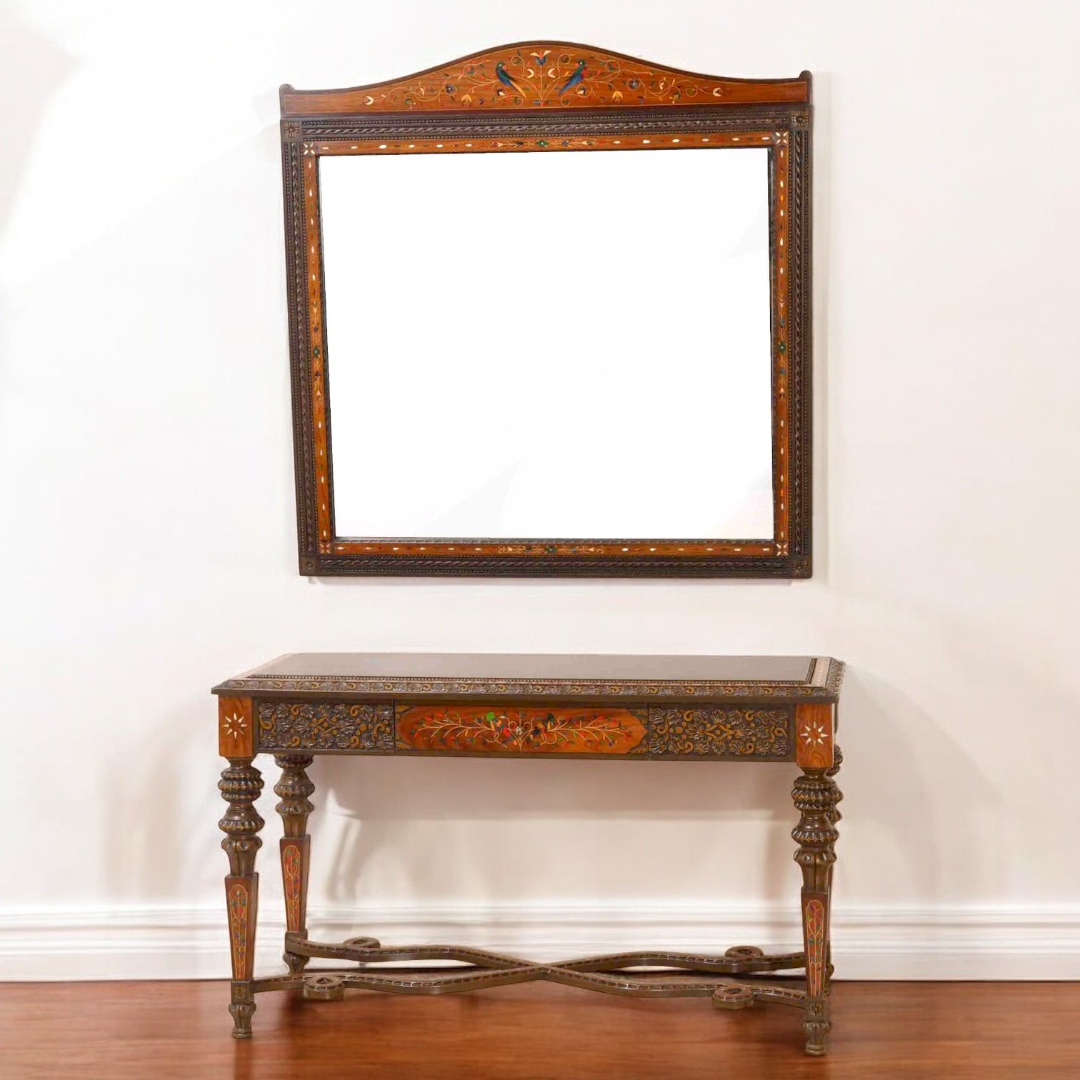 Immerse yourself in the rich heritage of our New Mughal Color Marquetry Console, meticulously crafted from solid sheesham wood. The intricate hand-carved details showcase a fusion of artistry and tradition, complemented by the exquisite dyed wood inlay featuring vibrant hues. This ensemble stands as a testament to the timeless beauty of Mughal craftsmanship, making it a distinctive piece within our classic ethnic collection. Elevate your living space with the regal allure of this console, where history and art seamlessly converge.