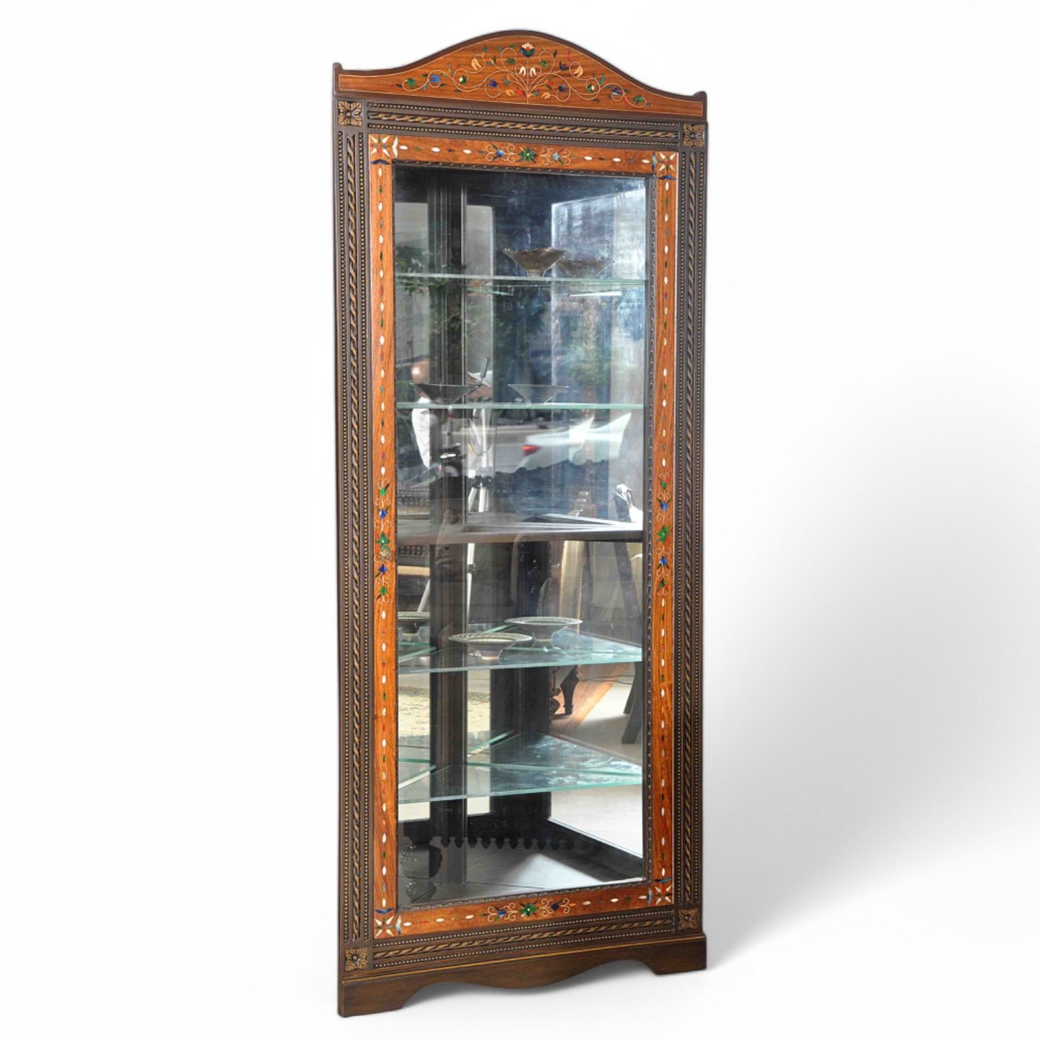 Immerse yourself in the cultural richness of our ethnic display cabinet, meticulously crafted to captivate the senses. This exceptional piece features an array of intricate details, including colored wood and mother-of-pearl inlay, creating a stunning tapestry of colors and textures. The hand-carved embellishments further amplify the cabinet’s allure, showcasing the skillful artistry that went into its creation. Each detail tells a story of tradition and craftsmanship, making this display cabinet not just a functional piece but a work of art that seamlessly blends heritage and contemporary design. Enliven your space with the charm of cultural aesthetics embodied in this remarkable ethnic display cabinet.